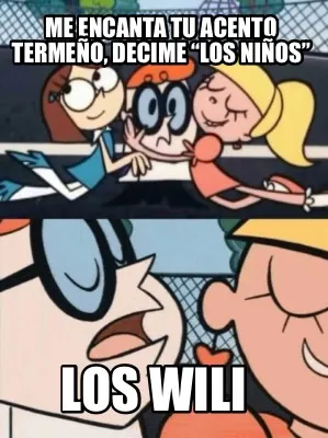 Make your own "Me encanta tu acento termeño, decime “los niños” Los wili" meme with MemeCreator's free online meme generator. Add text, stickers, and drawings — then download or share. No watermark, no sign-up required.