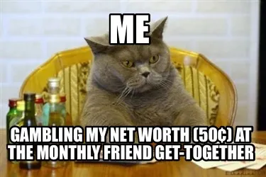 Make your own "Me Gambling my net worth (50¢) at the monthly friend get-together" meme with MemeCreator's free online meme generator. Add text, stickers, and drawings — then download or share. No watermark, no sign-up required.