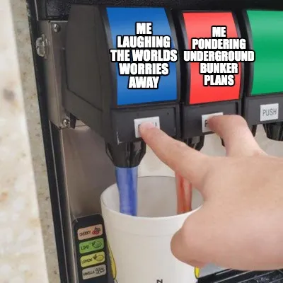Funny Me laughing the worlds worries away Me pondering underground bunker plans Meme Template