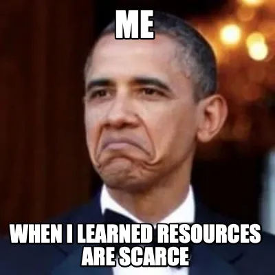 Make your own "Funny Me When i learned resources are scarce" meme with MemeCreator's free online meme generator. Add text, stickers, and drawings — then download or share. No watermark, no sign-up required.