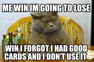 Make your own "Me win im going to lose win i forgot i had good cards and i don't use it" meme with MemeCreator's free online meme generator. Add text, stickers, and drawings — then download or share. No watermark, no sign-up required.