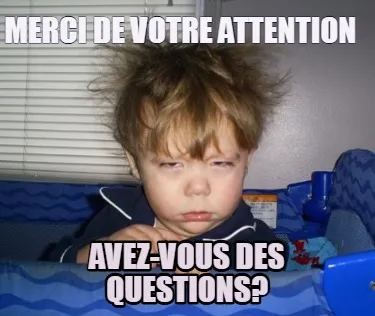 Make your own "Funny Merci de votre attention Avez-vous des questions?" meme with MemeCreator's free online meme generator. Add text, stickers, and drawings — then download or share. No watermark, no sign-up required.