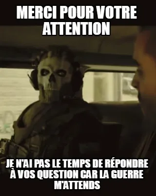 Make your own "Funny merci pour votre attention je n'ai pas le temps de répondre à vos question car" meme with MemeCreator's free online meme generator. Add text, stickers, and drawings — then download or share. No watermark, no sign-up required.