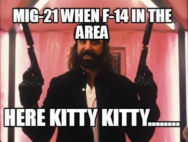 Make your own "Funny MiG-21 when F-14 in the area Here Kitty Kitty........" meme with MemeCreator's free online meme generator. Add text, stickers, and drawings — then download or share. No watermark, no sign-up required.