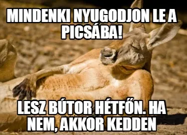 Make your own "Mindenki Nyugodjon Le A Picsba Lesz Btor Htfn. Ha Nem Akkor Kedden" meme with MemeCreator's free online meme generator. Add text, stickers, and drawings — then download or share. No watermark, no sign-up required.
