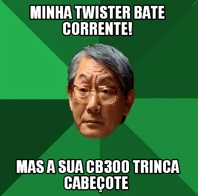 Make your own "Minha Twister bate corrente! mas a sua CB300 trinca cabeçote" meme with MemeCreator's free online meme generator. Add text, stickers, and drawings — then download or share. No watermark, no sign-up required.