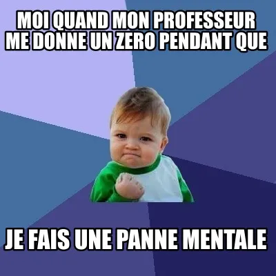 Make your own "Moi quand mon professeur me donne un zero pendant que je fais une panne mentale" meme with MemeCreator's free online meme generator. Add text, stickers, and drawings — then download or share. No watermark, no sign-up required.