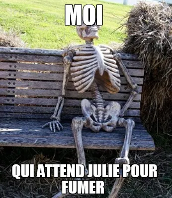 Make your own "Funny moi qui attend julie pour fumer" meme with MemeCreator's free online meme generator. Add text, stickers, and drawings — then download or share. No watermark, no sign-up required.