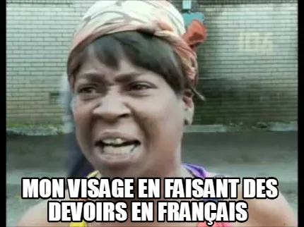 Make your own "Mon visage en faisant des devoirs en français" meme with MemeCreator's free online meme generator. Add text, stickers, and drawings — then download or share. No watermark, no sign-up required.