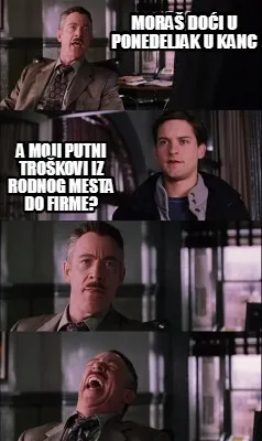 Make your own "Mora Doi U Ponedeljak U Kanc A Moji Putni Trokovi Iz Rodnog Mesta Do Firme" meme with MemeCreator's free online meme generator. Add text, stickers, and drawings — then download or share. No watermark, no sign-up required.