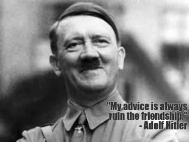 Make your own ""My advice is always ruin the friendship." - Adolf Hitler" meme with MemeCreator's free online meme generator. Add text, stickers, and drawings — then download or share. No watermark, no sign-up required.