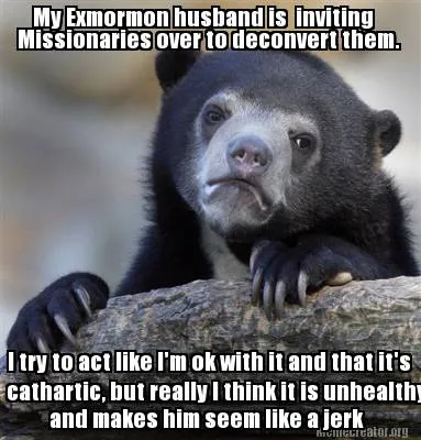 Make your own "Funny My Exmormon husband is inviting Missionaries over to deconvert them. I try to a" meme with MemeCreator's free online meme generator. Add text, stickers, and drawings — then download or share. No watermark, no sign-up required.
