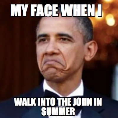 Make your own "My face when i walk into the john in summer" meme with MemeCreator's free online meme generator. Add text, stickers, and drawings — then download or share. No watermark, no sign-up required.