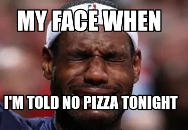 Make your own "My face when I'm told no pizza tonight" meme with MemeCreator's free online meme generator. Add text, stickers, and drawings — then download or share. No watermark, no sign-up required.