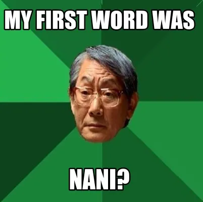Make your own "Funny my first word was nani?" meme with MemeCreator's free online meme generator. Add text, stickers, and drawings — then download or share. No watermark, no sign-up required.