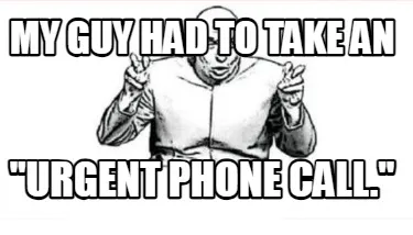 Make your own "My guy had to take an "urgent phone call."" meme with MemeCreator's free online meme generator. Add text, stickers, and drawings — then download or share. No watermark, no sign-up required.