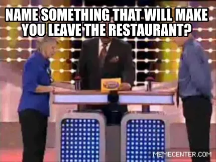 Make your own "Funny Name something that will make you leave the restaurant?" meme with MemeCreator's free online meme generator. Add text, stickers, and drawings — then download or share. No watermark, no sign-up required.