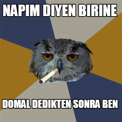 Make your own "Napim diyen birine domal dedikten sonra ben" meme with MemeCreator's free online meme generator. Add text, stickers, and drawings — then download or share. No watermark, no sign-up required.