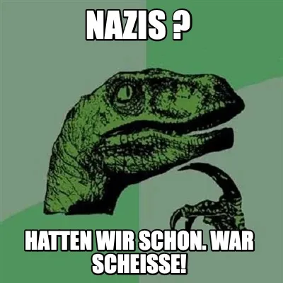 Make your own "Funny Nazis ? Hatten wir schon. War scheiße!" meme with MemeCreator's free online meme generator. Add text, stickers, and drawings — then download or share. No watermark, no sign-up required.