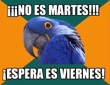 Make your own "¡¡¡No es martes!!! ¡Espera es viernes!" meme with MemeCreator's free online meme generator. Add text, stickers, and drawings — then download or share. No watermark, no sign-up required.