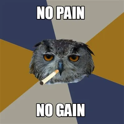 Make your own "No pain No gain" meme with MemeCreator's free online meme generator. Add text, stickers, and drawings — then download or share. No watermark, no sign-up required.
