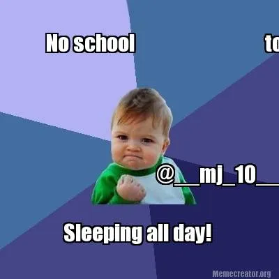 Make your own "Funny No school tomorrow! Sleeping all day! @__mj" meme with MemeCreator's free online meme generator. Add text, stickers, and drawings — then download or share. No watermark, no sign-up required.