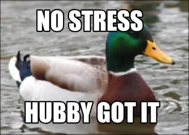 Make your own "No stress Hubby got it" meme with MemeCreator's free online meme generator. Add text, stickers, and drawings — then download or share. No watermark, no sign-up required.