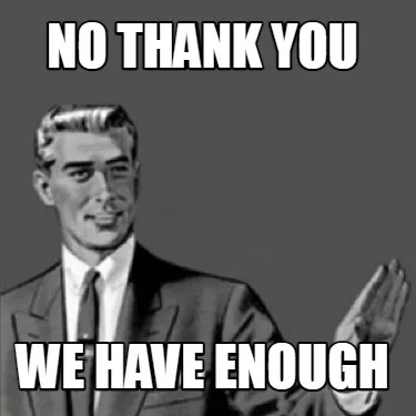Make your own "No thank you we have enough" meme with MemeCreator's free online meme generator. Add text, stickers, and drawings — then download or share. No watermark, no sign-up required.