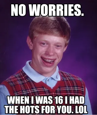 Make your own "No worries. When I was 16 I had the hots for you. lol" meme with MemeCreator's free online meme generator. Add text, stickers, and drawings — then download or share. No watermark, no sign-up required.