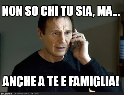 Make your own "Non so chi tu sia, ma... anche a te e famiglia!" meme with MemeCreator's free online meme generator. Add text, stickers, and drawings — then download or share. No watermark, no sign-up required.