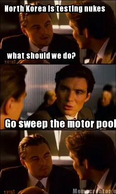 Create North Korea is testing nukes what should we do? Go sweep the motor pool Meme