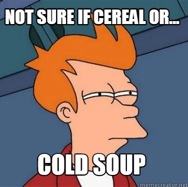 Make your own "Not sure if cereal or... cold soup" meme with MemeCreator's free online meme generator. Add text, stickers, and drawings — then download or share. No watermark, no sign-up required.