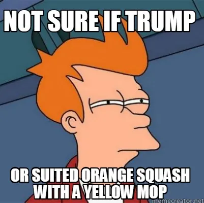 Make your own "Funny Not sure if trump or suited orange squash with a yellow mop" meme with MemeCreator's free online meme generator. Add text, stickers, and drawings — then download or share. No watermark, no sign-up required.