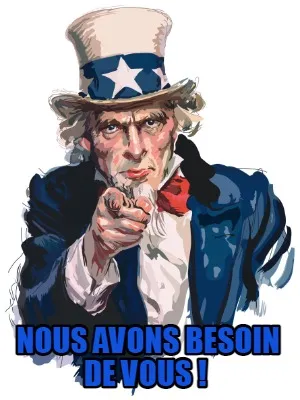 Make your own "Funny Nous avons besoin de vous !" meme with MemeCreator's free online meme generator. Add text, stickers, and drawings — then download or share. No watermark, no sign-up required.