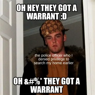 Make your own "Funny Oh hey they got a warrant :D Oh &#%* they got a warrant the police officer who I" meme with MemeCreator's free online meme generator. Add text, stickers, and drawings — then download or share. No watermark, no sign-up required.