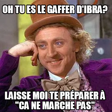 Make your own "Oh tu es le gaffer d'Ibra? Laisse moi te préparer à "Ca ne marche pas"" meme with MemeCreator's free online meme generator. Add text, stickers, and drawings — then download or share. No watermark, no sign-up required.