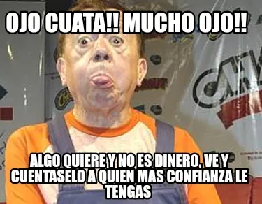Make your own "OJO CUATA!! MUCHO OJO!! Algo quiere y no es dinero, ve y cuentaselo a quien mas" meme with MemeCreator's free online meme generator. Add text, stickers, and drawings — then download or share. No watermark, no sign-up required.