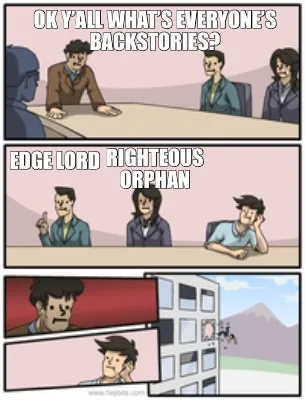 Create Funny Ok y’all what’s everyone’s backstories? Edge lord Righteous orphan Meme