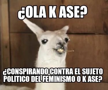 Make your own "¿Ola k ase? ¿Conspirando contra el sujeto politico del feminismo o k ase?" meme with MemeCreator's free online meme generator. Add text, stickers, and drawings — then download or share. No watermark, no sign-up required.
