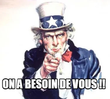 Make your own "ON a Besoin de vous !!" meme with MemeCreator's free online meme generator. Add text, stickers, and drawings — then download or share. No watermark, no sign-up required.