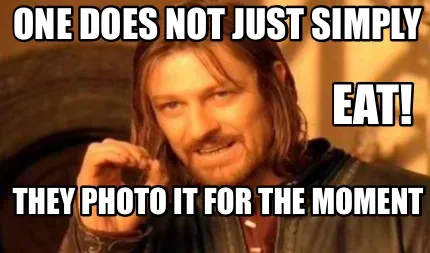 Make your own "One does not just simply They photo it for the moment Eat!" meme with MemeCreator's free online meme generator. Add text, stickers, and drawings — then download or share. No watermark, no sign-up required.