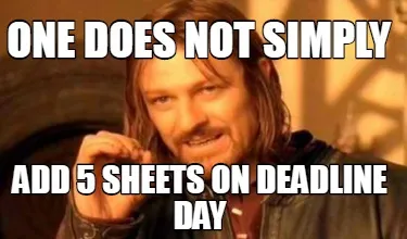 Make your own "One does not simply add 5 sheets on deadline day" meme with MemeCreator's free online meme generator. Add text, stickers, and drawings — then download or share. No watermark, no sign-up required.