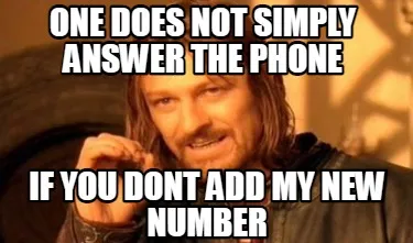 Make your own "One does not simply answer the phone if you dont add my new number" meme with MemeCreator's free online meme generator. Add text, stickers, and drawings — then download or share. No watermark, no sign-up required.