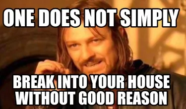 Make your own "Funny One does not simply break into your house without good reason" meme with MemeCreator's free online meme generator. Add text, stickers, and drawings — then download or share. No watermark, no sign-up required.