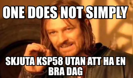 Make your own "One does not simply Skjuta KSP58 utan att ha en bra dag" meme with MemeCreator's free online meme generator. Add text, stickers, and drawings — then download or share. No watermark, no sign-up required.