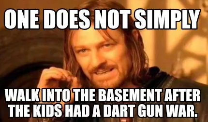 Make your own "One does not simply Walk into the Basement after the kids had a dart gun war." meme with MemeCreator's free online meme generator. Add text, stickers, and drawings — then download or share. No watermark, no sign-up required.