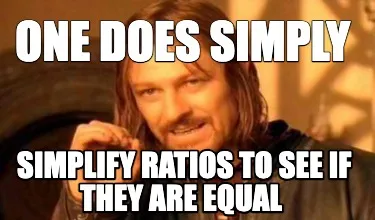 Make your own "One does simply simplify ratios to see if they are equal" meme with MemeCreator's free online meme generator. Add text, stickers, and drawings — then download or share. No watermark, no sign-up required.