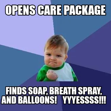 Create Opens care package Finds soap, breath spray, and balloons! YYYESSSS!!! Meme