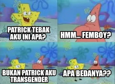 Make your own "Patrick tebak aku ini apa? Apa bedanya?? bukan patrick aku transgender Hmm..." meme with MemeCreator's free online meme generator. Add text, stickers, and drawings — then download or share. No watermark, no sign-up required.