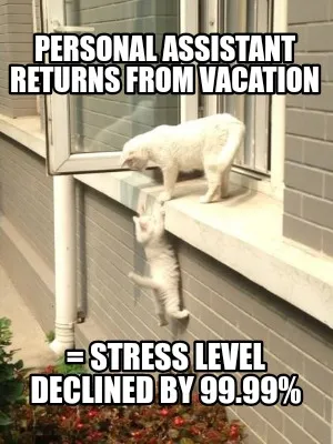 Create Personal assistant returns from vacation = Stress level declined by 99.99% Meme